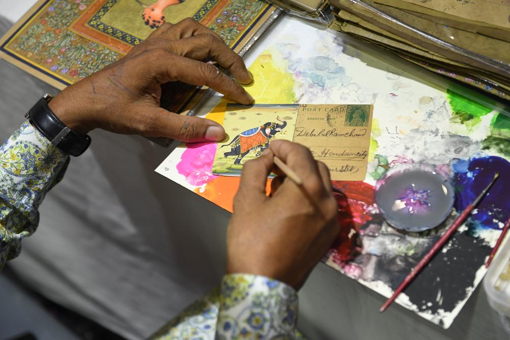 5月24日,印度艺术家在第二十届中国(深圳)国际文化产业博览交易会上绘制印度细密画。