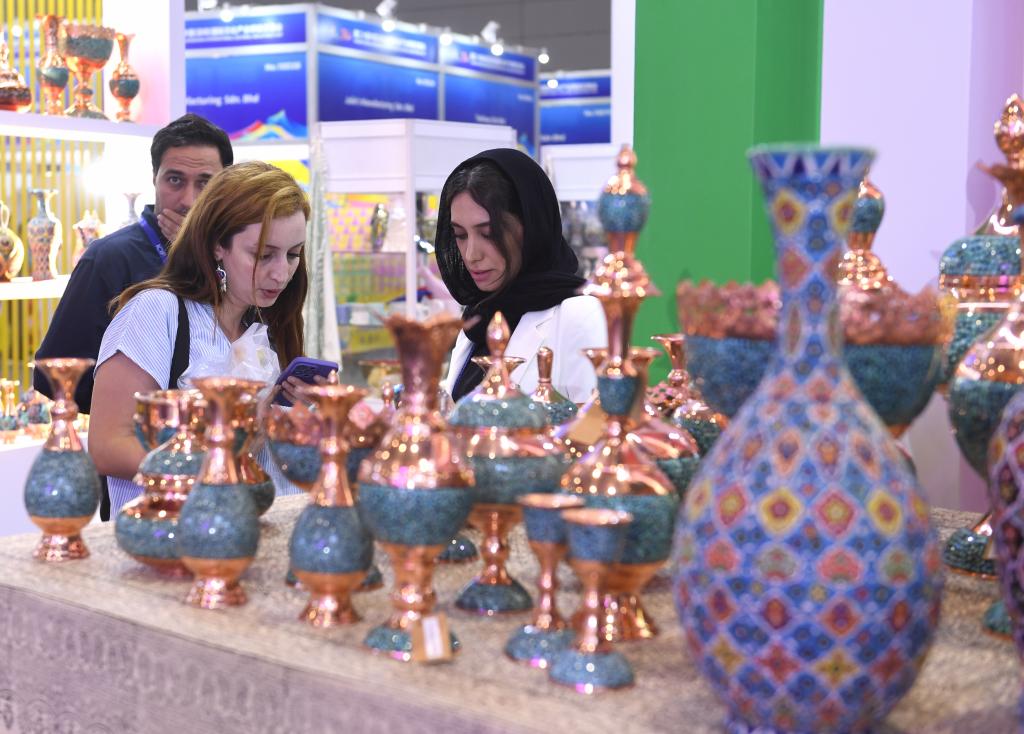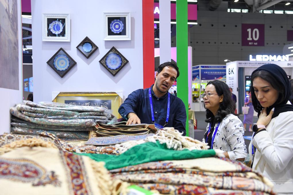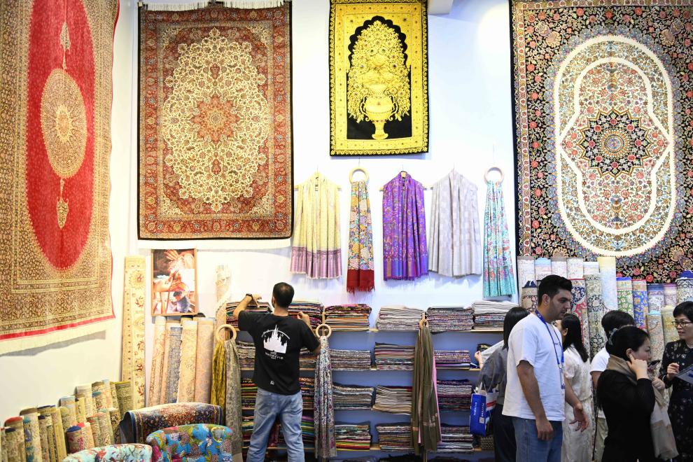 5月24日,观众在第二十届中国(深圳)国际文化产业博览交易会伊朗展台选购毛毯。
