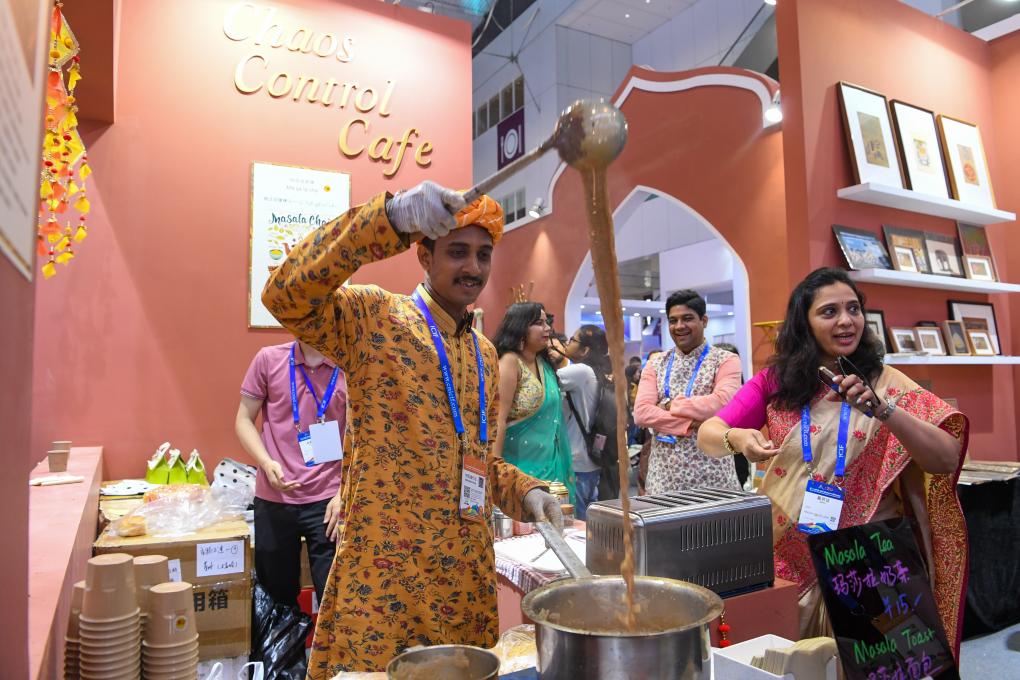 5月24日,在第二十届中国(深圳)国际文化产业博览交易会印度展台,参展商展示印度玛莎拉奶茶。